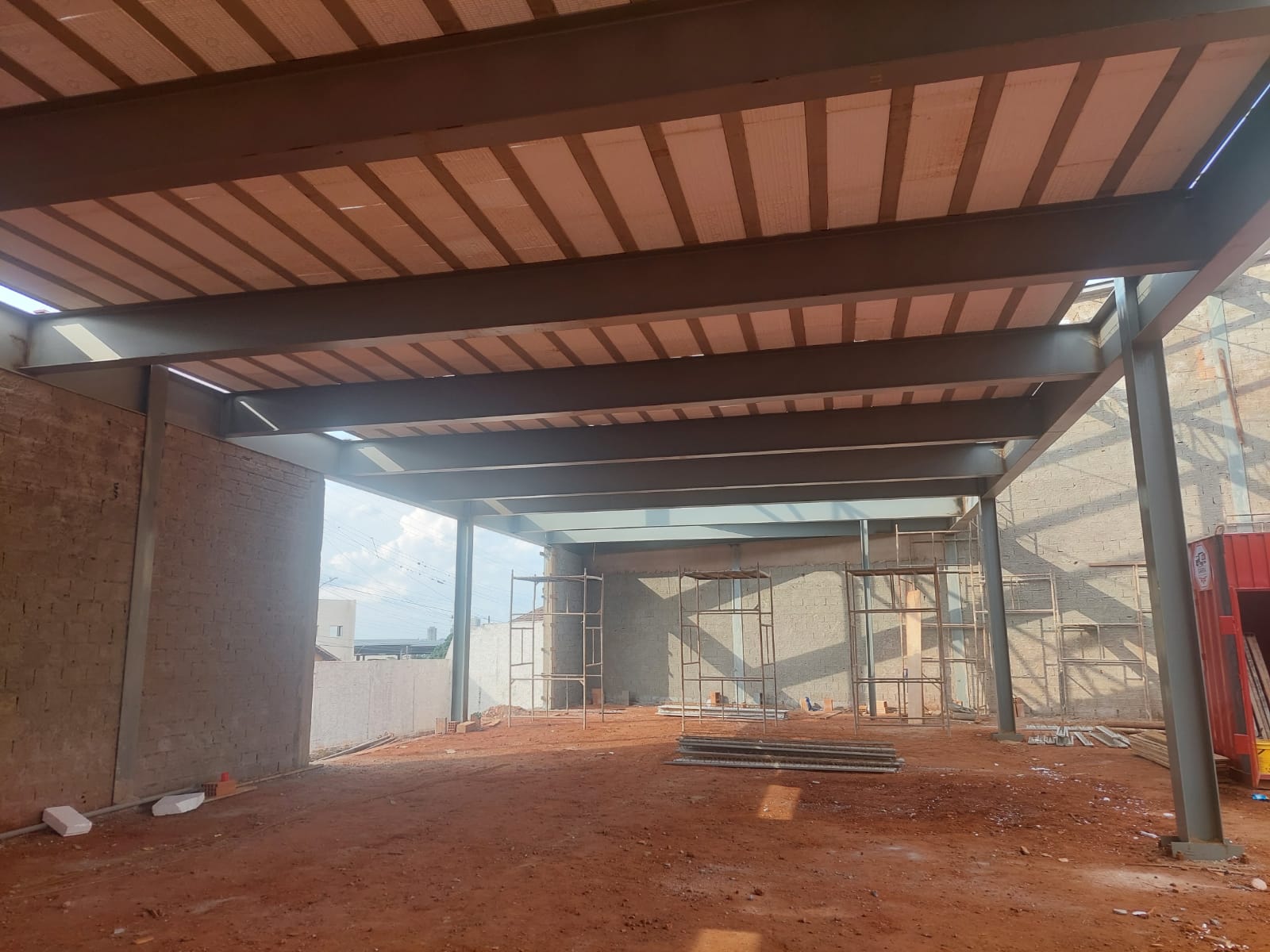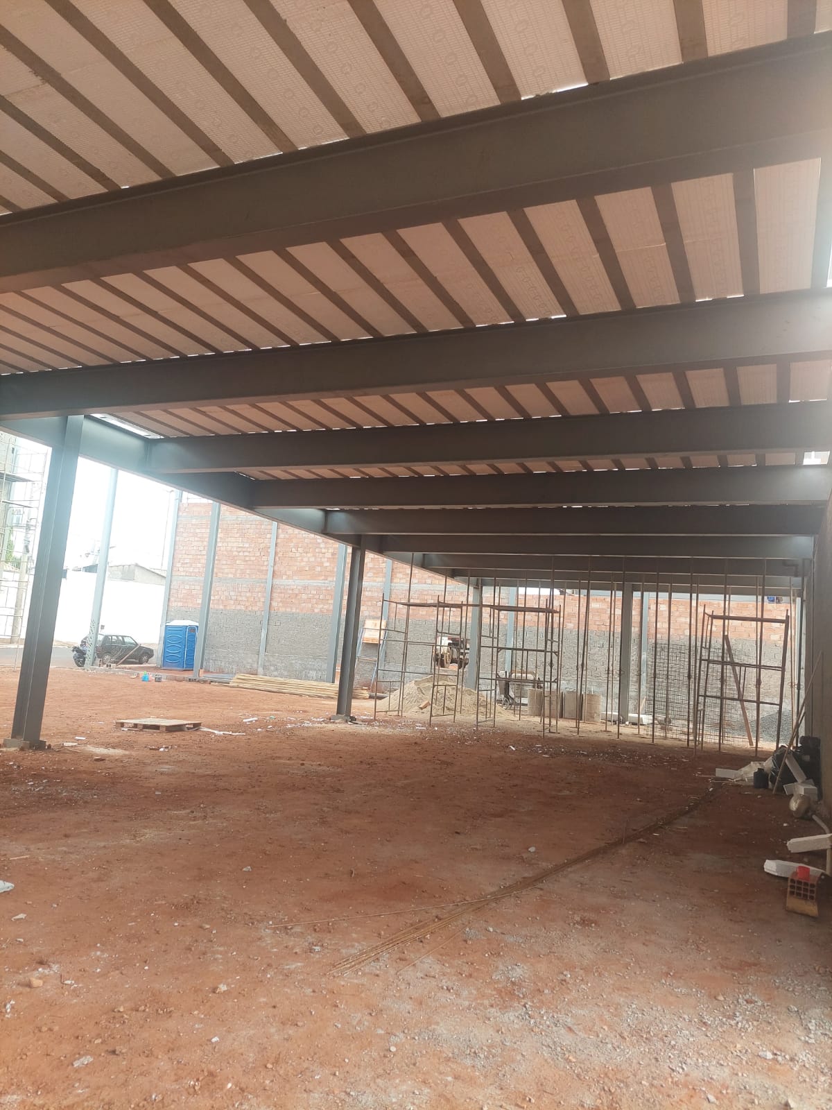Construção de 2 galpões, sendo um galpão destinado para conjunto de lojas e outro galpão destinado para academia. Cada galpão possui uma área de aproximadamente 350 mts². Utilizado estrutura metálica e laje para piso com ferragem adicional.