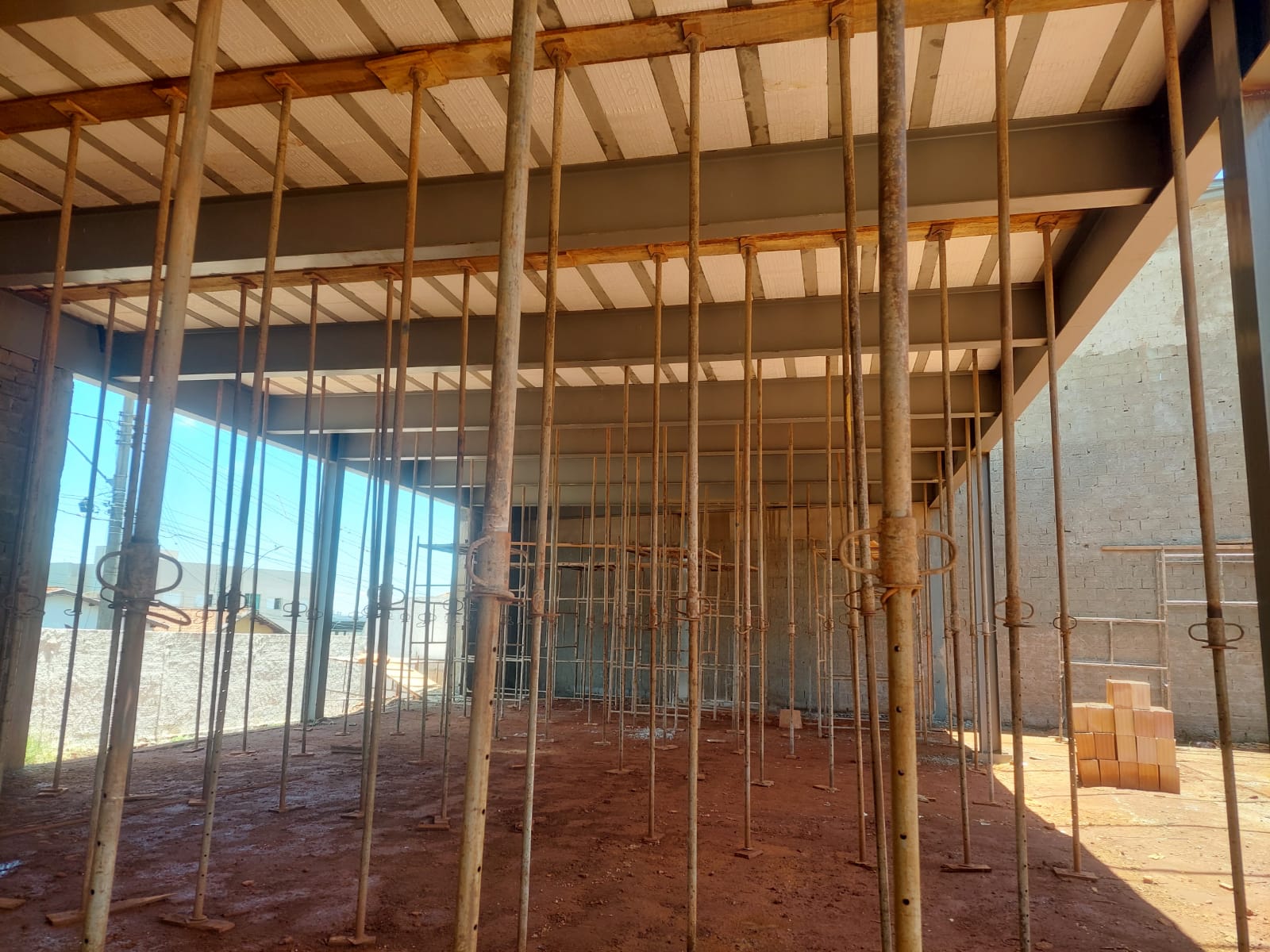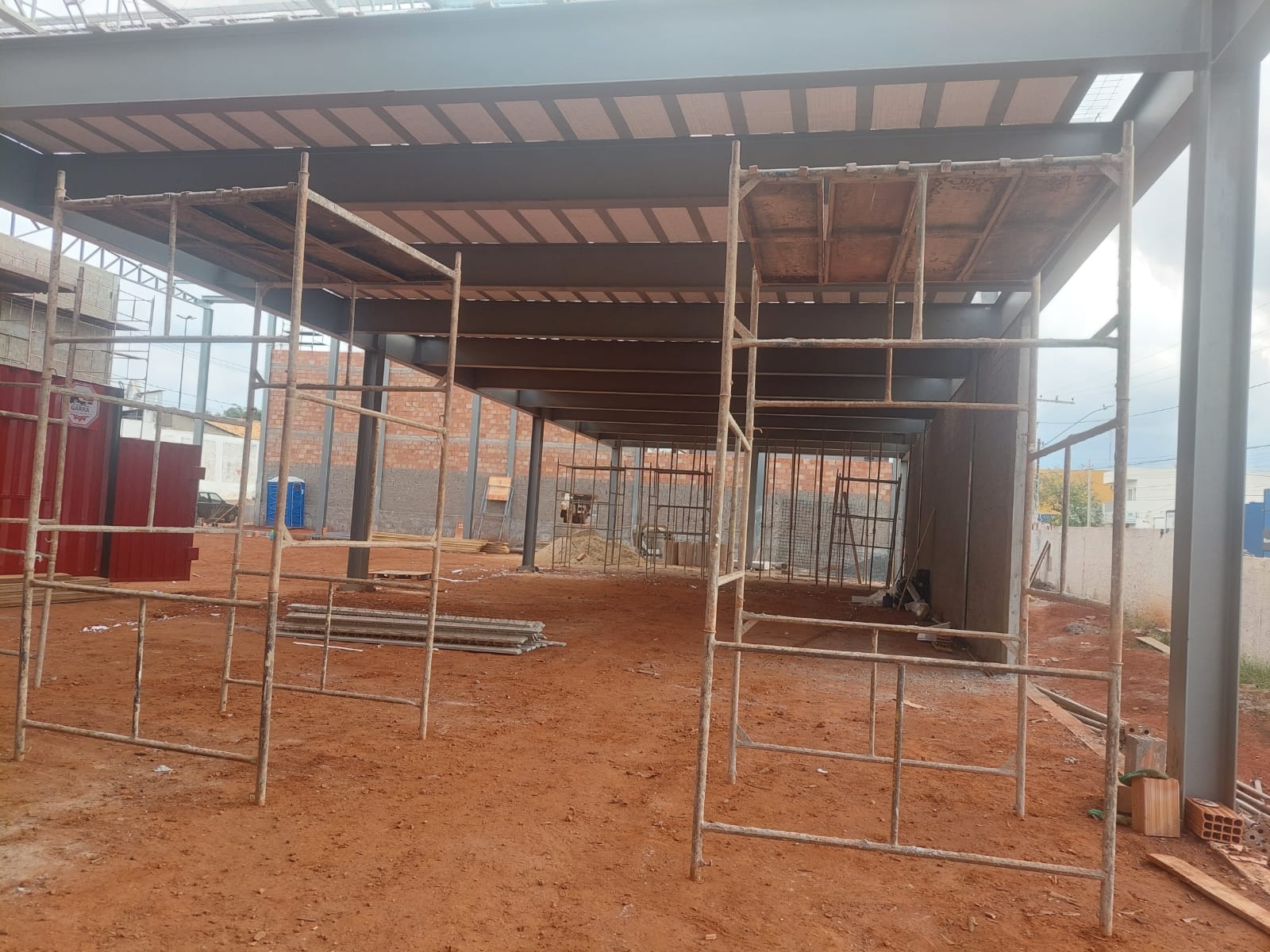 Construção de 2 galpões, sendo um galpão destinado para conjunto de lojas e outro galpão destinado para academia. Cada galpão possui uma área de aproximadamente 350 mts². Utilizado estrutura metálica e laje para piso com ferragem adicional.